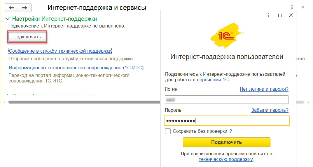 Подключаем интернет-поддержку в разделе: Настройки – Администрирование – Интернет-поддержка и сервисы – Настройки Интернет-поддержки.