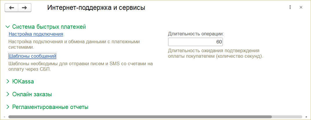 Далее в разделе Система быстрых платежей по ссылке Настройки интеграции переходим к созданию новой настройки подключения к СБП. Справа от ссылки можно указать длительность ожидания подтверждения оплаты покупателем в секундах.