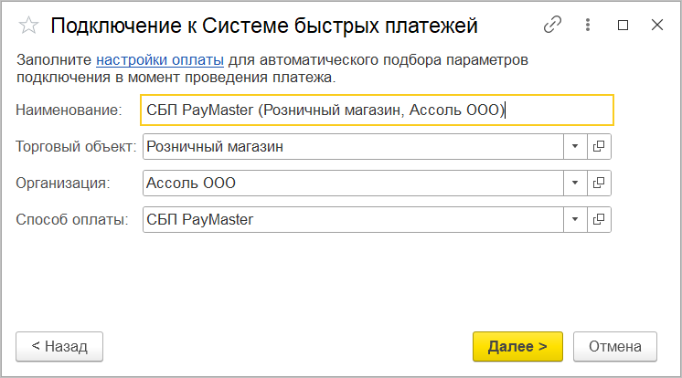 Указываем “Наименование”, “Торговый объект”, “Организацию” и “Способ оплаты”.