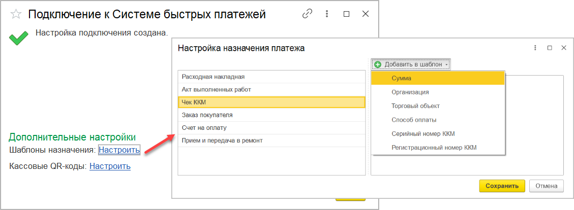 С помощью кнопки Создать создаем новую настройку с указанием банка-участника СБП для оплаты.